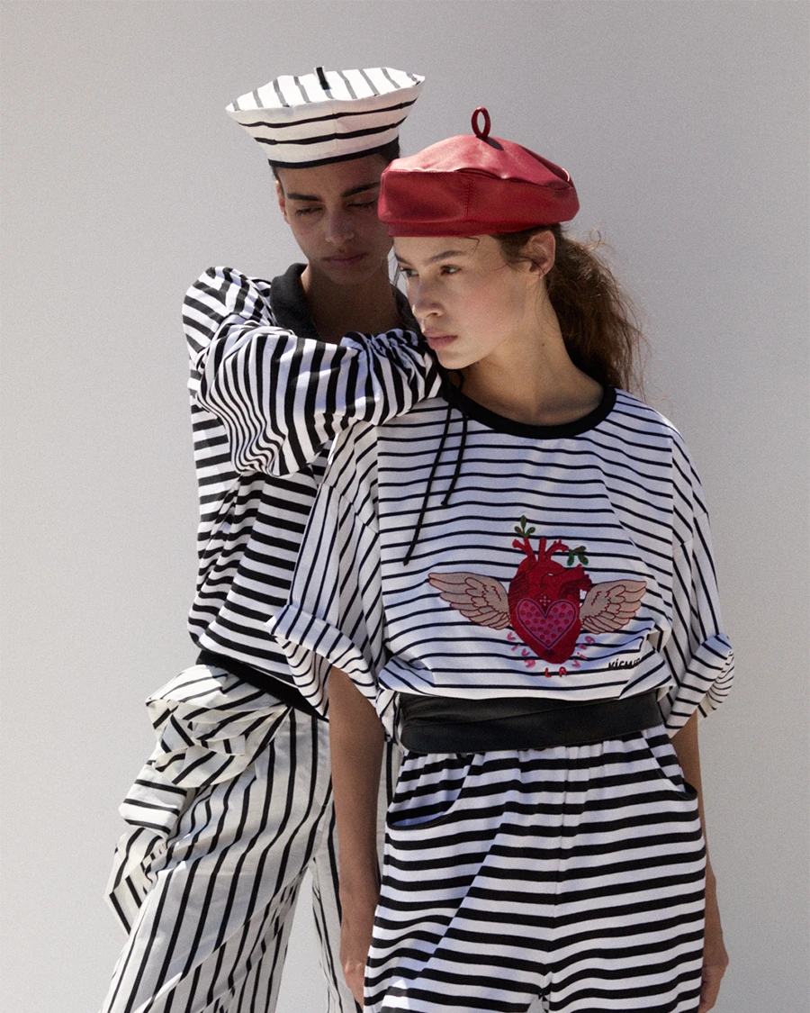 Komfort jest bardzo ważny zarówno w trakcie wakacji, jak i na co dzień. Dlatego postaw na wygodny casualowy czarno-biały dresowy komplet. Marinistyczny wzór i wykończenia z czarnej prążkowanej dzianiny spotykają się z fasonem królującym w latach 80-tych. A wszystko wzbogacone o elegancki kołnierzyk i przewrotny autorski haft na plecach.
