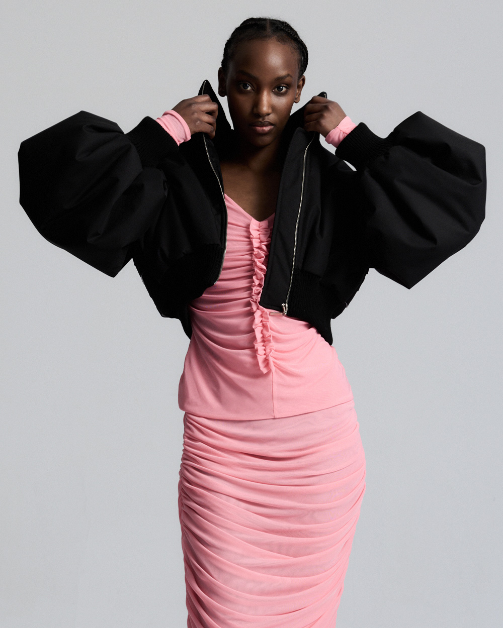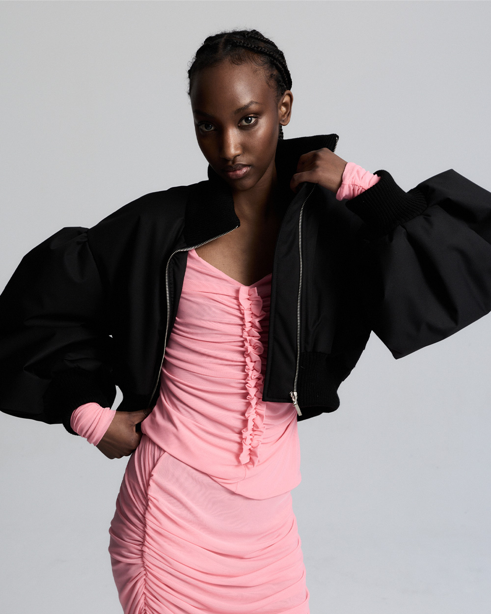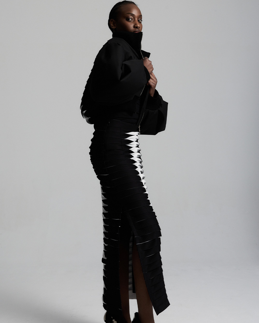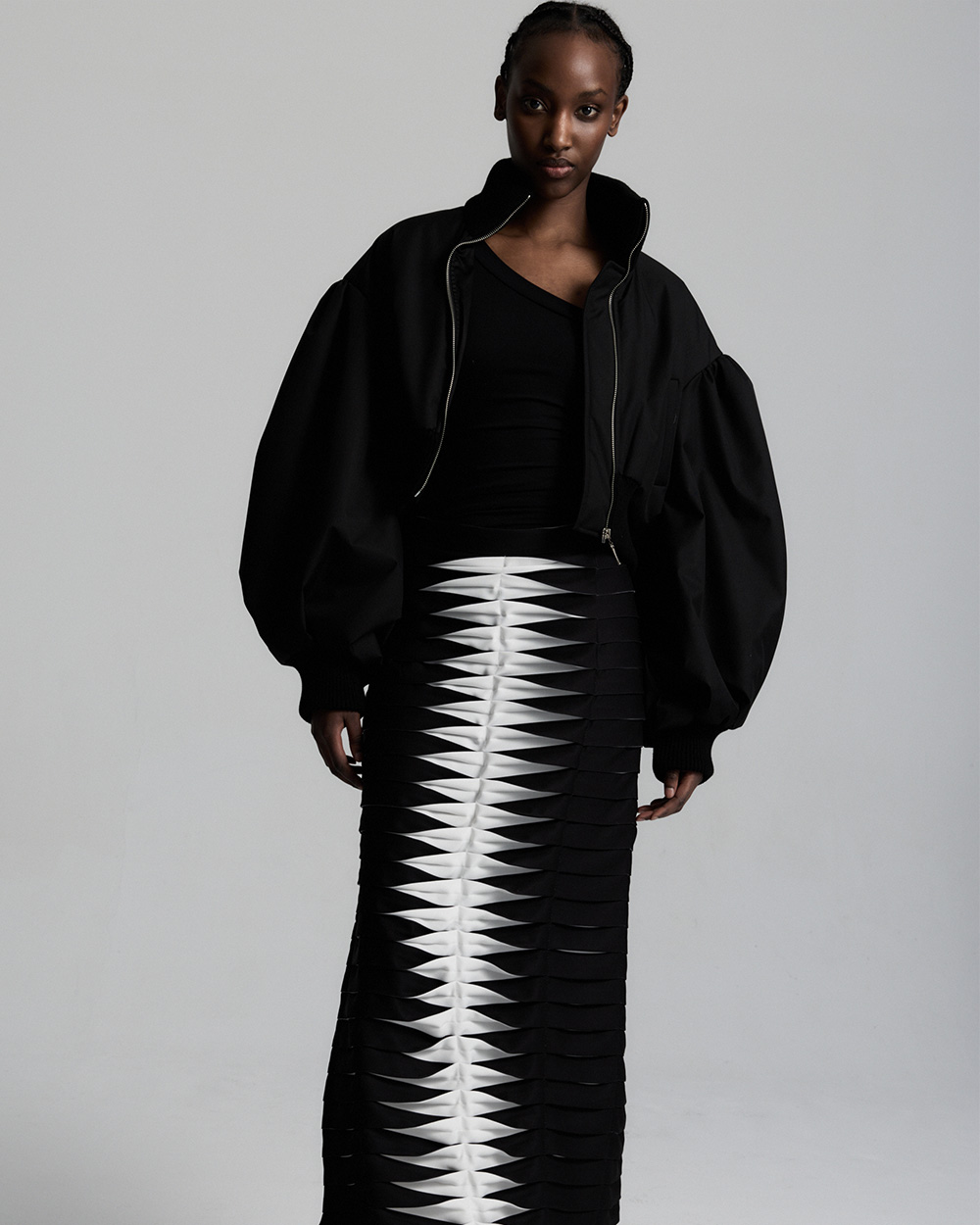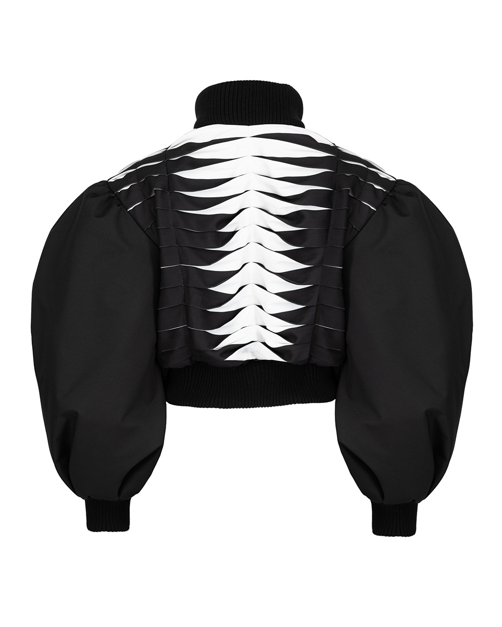 Wyjątkowa kurtka bomberka o skróconej formie. Wzbogacona została o ręcznie układane, precyzyjne przeszycia, dzięki którym na plecach kurtki tworzy się piękny geometryczny wzór oraz szerokie rękawy wykończone ściągaczem. Kurtka ta nada nowoczesnego charakteru każdej Twojej stylizacji.