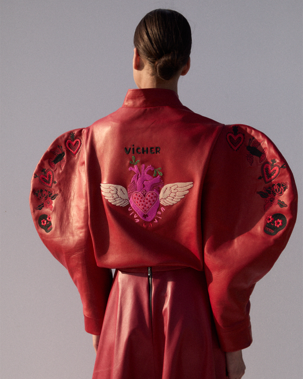 Przepiękna bomberka wykonana z najwyższej jakości skóry licowej w kolorze głębokiej czerwieni. Wzbogacona została o wspaniałe, malarskie hafty i przestrzenne rękawy tworzące kształt serca.