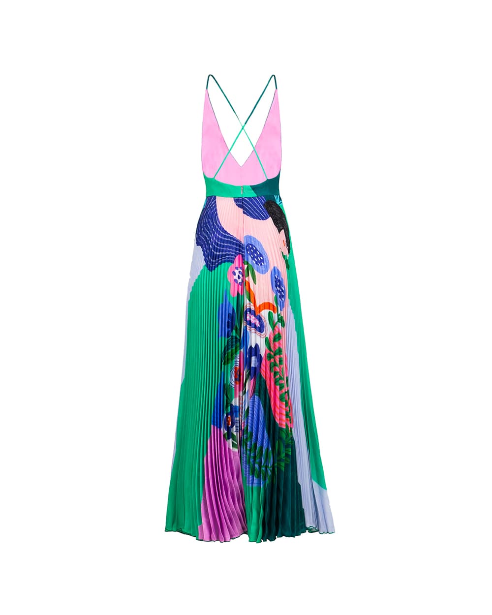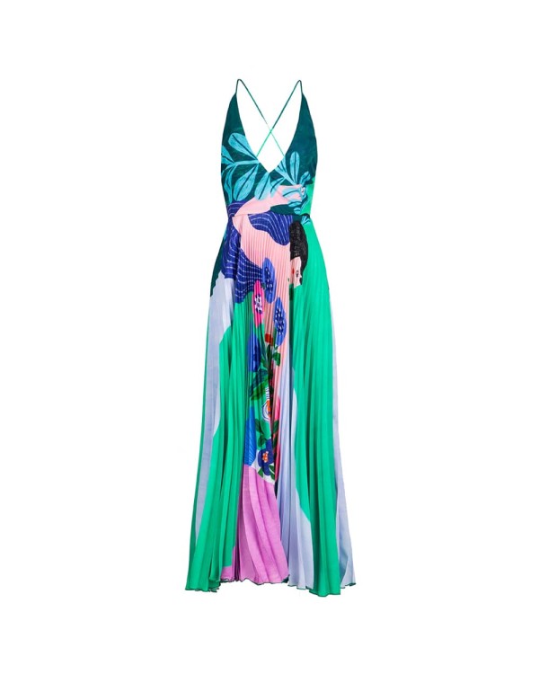 Plisowana sukienka z autorskim nadrukiem inspirowanym sztuką Zofii Stryjeńskiej, niczym obraz, pachworkowo łączona ilustracja na tkaninie, by uzyskać efekt „art to wear”. Plisowana, z pięknymi odkrytymi plecami na cienkich ramiączkach typu spaghetti i głębokim dekoltem w literę V. Zmysłowa, oszałamiająca, ultra kobieca.