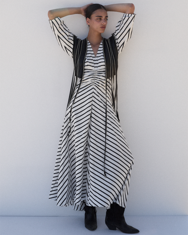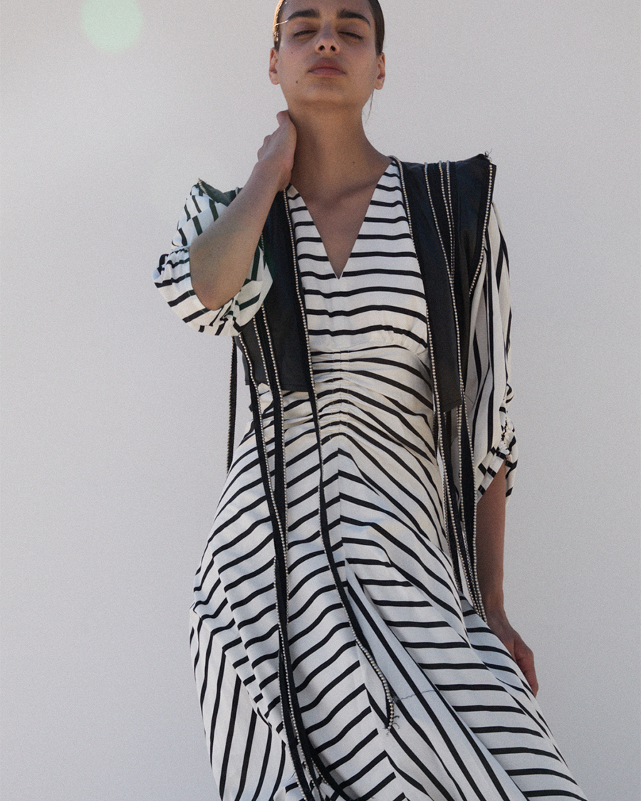 Wyjątkowo piękna, sukienka o długości 7/8, z delikatnie bufiastymi rękawami, oraz ozdobnymi godetami wykonana z najwyższej jakości włoskiej popeliny bawełnianej. Ozdobiona została uniwersalnym i ponadczasowym ukochanym przez VICHER, wzorem jakim są czarne paski na białym tle. Patchworkowo krojone paski tworzą misterny wzór, przywodzący na myśl popart. Prezentuje się dzięki temu niezwykle elegancko, ale sprawdzi się również w codziennych stylizacjach.